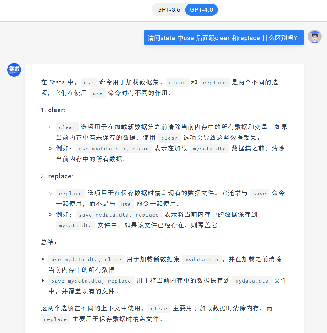 在 Stata 中,use 命令用于加载数据集。当你在 use 命令后面加上 clear 或 replace 选项时,它们分别有不同的作用: